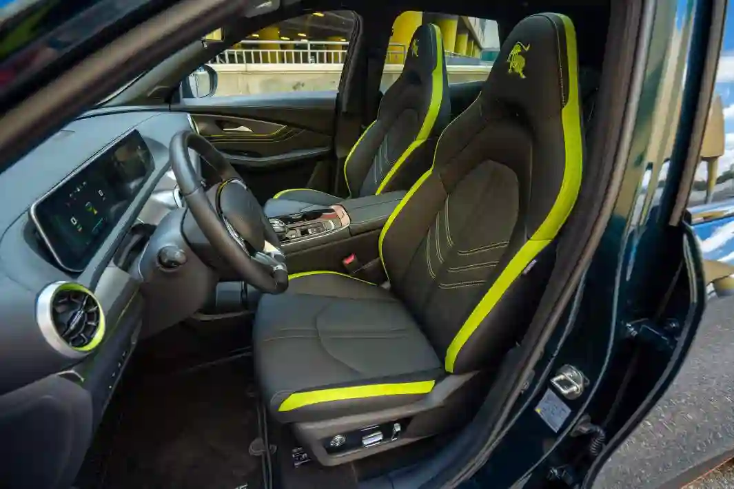 Сложный зеленый цвет кузова с зависимости от освещения меняет оттенок. Секции причудливых фар ритмически зажигаются, приветствуя водителя. На асфальт проецируется шильдик — щит с китайским драконом и надписью Forting тем же шрифтом, каким пишут Porsche. Этот дракон прячется в хрустальном селекторе режимов движения, а еще два ярко-зеленых вышиты на подголовниках кресел-ковшей.